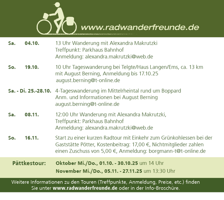 Weitere Informationen zu den Touren (Treffpunkte, Anmeldung, Preise, etc.) finden Sie unter www.radwanderfreunde.de oder in der Info-Broschüre.